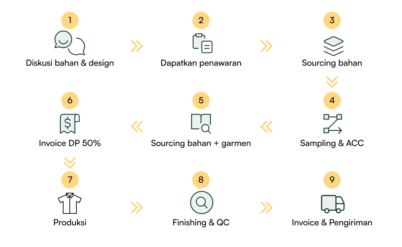 Kamu akan mendapatkan konsultasi gratis, jasa sourcing bahan & design yang akan dipandu oleh in-house consultant kami. Kamu juga akan mendapatkan sampel gratis apabila kamu melanjutkan First Production Order. Setelahnya, kami akan meng-update proses produksi kepada kamu secara berkala dan QC dari tim kami sehingga produksi kamu bisa selesai tepat waktu.