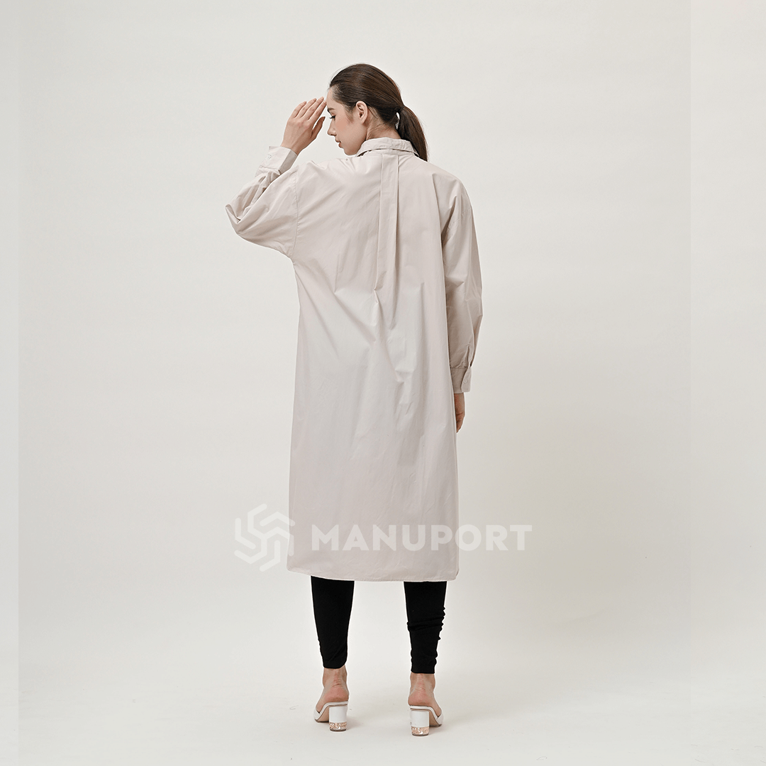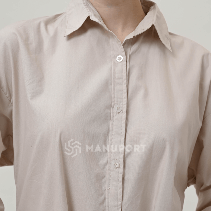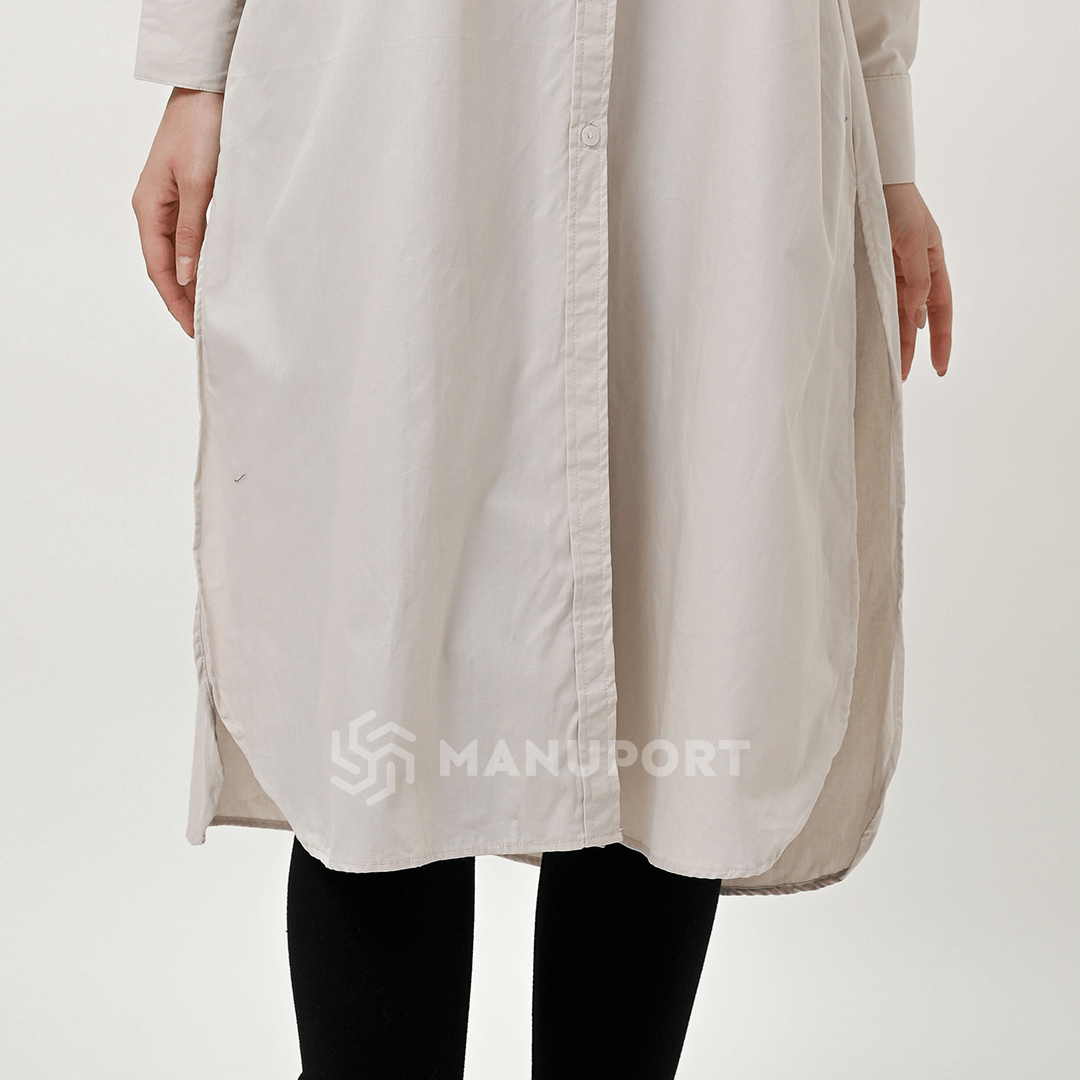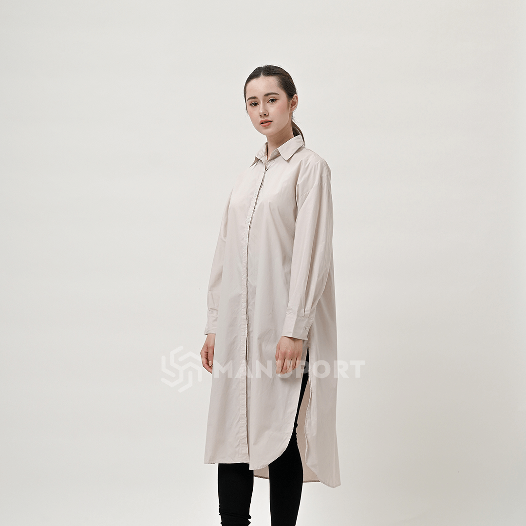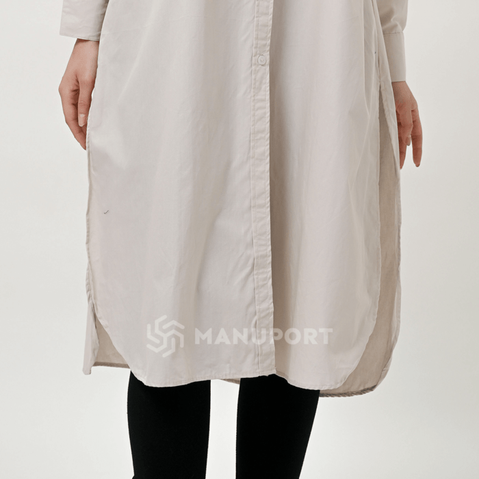 Tunic simpel dengan tangan panjang dan lengan kemeja bermanset dan belahan di bagian bawah.