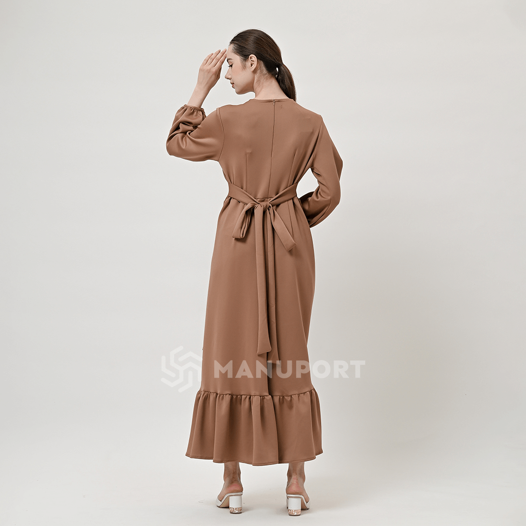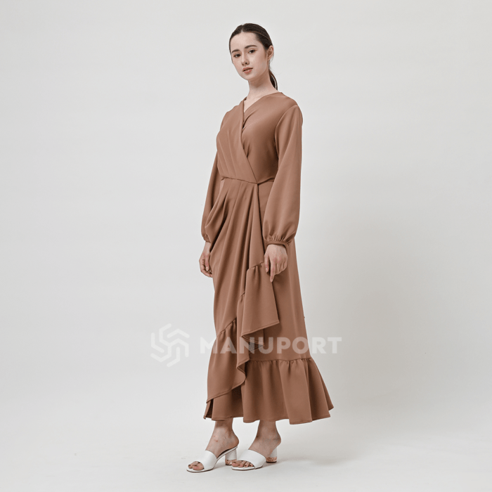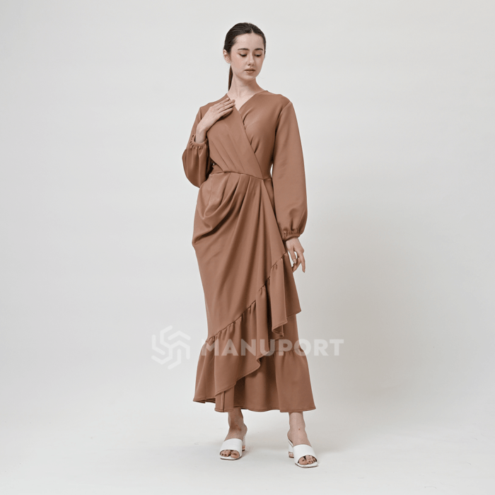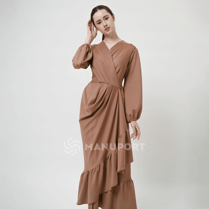 Dress dengan bagian depan overlap dan detail drapery asimetris di bagian pinggang.